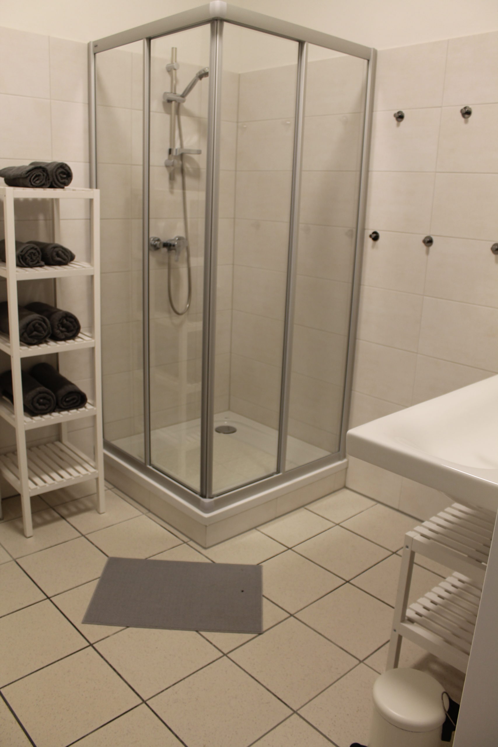 Sanitärräume: Dusche mit WC: Jedes Apartment hat ein eigenes Badezimmer & WC. Das Gästehaus hat ebenfalls 8 Zimmer mit jeweils einem eigenen Badezimmer & WC.